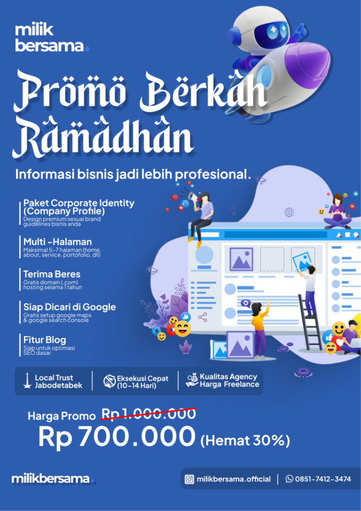 Solusi DigitalTerintegrasi & Terjangkau. Kami membantu UMKM dan bisnis berkembang dengan website profesional, manajemen sosial media, dan branding yang berorientasi pada hasil nyata. Konsultasi Gratis Dipercaya oleh Bisnis 0 + Layanan Unggulan Kami Solusi digital menyeluruh untuk kebutuhan modern Anda. Custom Web Development Dari landing page hingga web aplikasi kompleks, kami membangun dengan teknologi terbaru seperti React, Next.js, dan Tailwind untuk performa maksimal. E-Commerce Toko online yang dikonversi untuk penjualan tinggi. UI/UX Design Desain yang memanjakan mata sekaligus memudahkan pengguna. Kami fokus pada estetika 'Silicon Valley'. Web Maintenance Lupakan masalah teknis. Kami menjaga website Anda tetap aman, cepat, dan selalu terupdate secara berkala. Featured PRojects Our Case Studies Fusce dignissim blandit justo, eget elementum risus tristique. Nunc lacus lacus, sit amet accumsan est pulvinar non. Praesent tristique enim lorem. Marketing Sit dapibus auctor Marketing Sed efficitur faucibus Web Development Dapibus curabitur UX/UI Design Est mattis sit Brand Identity Lacus vel Brand Identity Sit dapibus auctor Divisi Layanan Kami Setiap divisi dikelola oleh ahli di bidangnya. Best Seller Web Development Mulai dari 700.000 (One-Time) Landing Page Express (Rp 700rb) Corporate Identity (Rp 1jt) Web App & Dashboard (Start 3jt) Lihat Detail Lengkap Digital Marketing Mulai dari 600.000 /Bulan Sosmed Content Only (Rp 600rb) Sosmed Growth (Start Rp 800 rb) Full Management (Start 3jt) Lihat Detail Lengkap Branding & Add-ons Mulai dari 800.000 (One-Time) Logo & Identity (Start Rp 800rb) Web Maintenance (Start Rp 250rb) Video Editing Eceran (Start Rp 150rb) Lihat Detail Lengkap Hasil Kerja Tim Melihat bagaimana kami membantu partner kami bertumbuh. Undangan Milik Besama Berkah Abadi Pangan Kelana Nusa Lihat Detail Lengkap Apa kata mereka? Kepuasan Anda adalah motivasi terbesar kami untuk terus berkarya. cinta maya"Senang sekali bisa bekerja sama dengan tim ini. Mereka benar-benar mengerti apa yang saya butuhkan sejak awal." harun firdasu"Hasilnya keren banget! Gak nyangka bisa dapet kualitas sebagus ini dengan pelayanan yang sangat ramah. Sukses terus!" Have a Project in Mind? Nullam eget felis eget nunc lobortis. Faucibus ornare suspendisse sed nisi sagittis. Get in Touch Artikel Terbaru Simak wawasan, tips, dan update terbaru seputar dunia teknologi dan desain langsung dari tim kami. No results